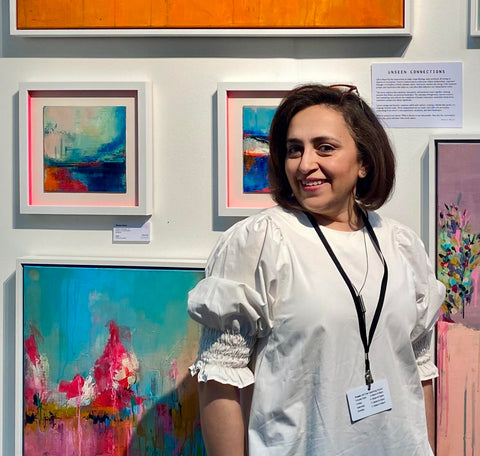 Born and raised in the vibrant cities of India, Shveta Maini grew up in a swirl of cultures, languages, and stories. In 2020, she swapped the structured world of textile design for the wild beauty of full-time abstract painting—and hasn’t looked back.